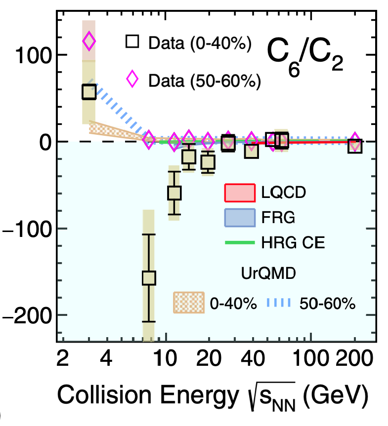 实验观测到的负的六阶累积矩以及各阶次的层级(hierarchy)现象与从第一性原理出发的格点QCD的计算结果相符合,揭示出高能核碰撞中热化夸克胶子等离子体已经形成且强子相和夸克物质相为平滑穿越。
