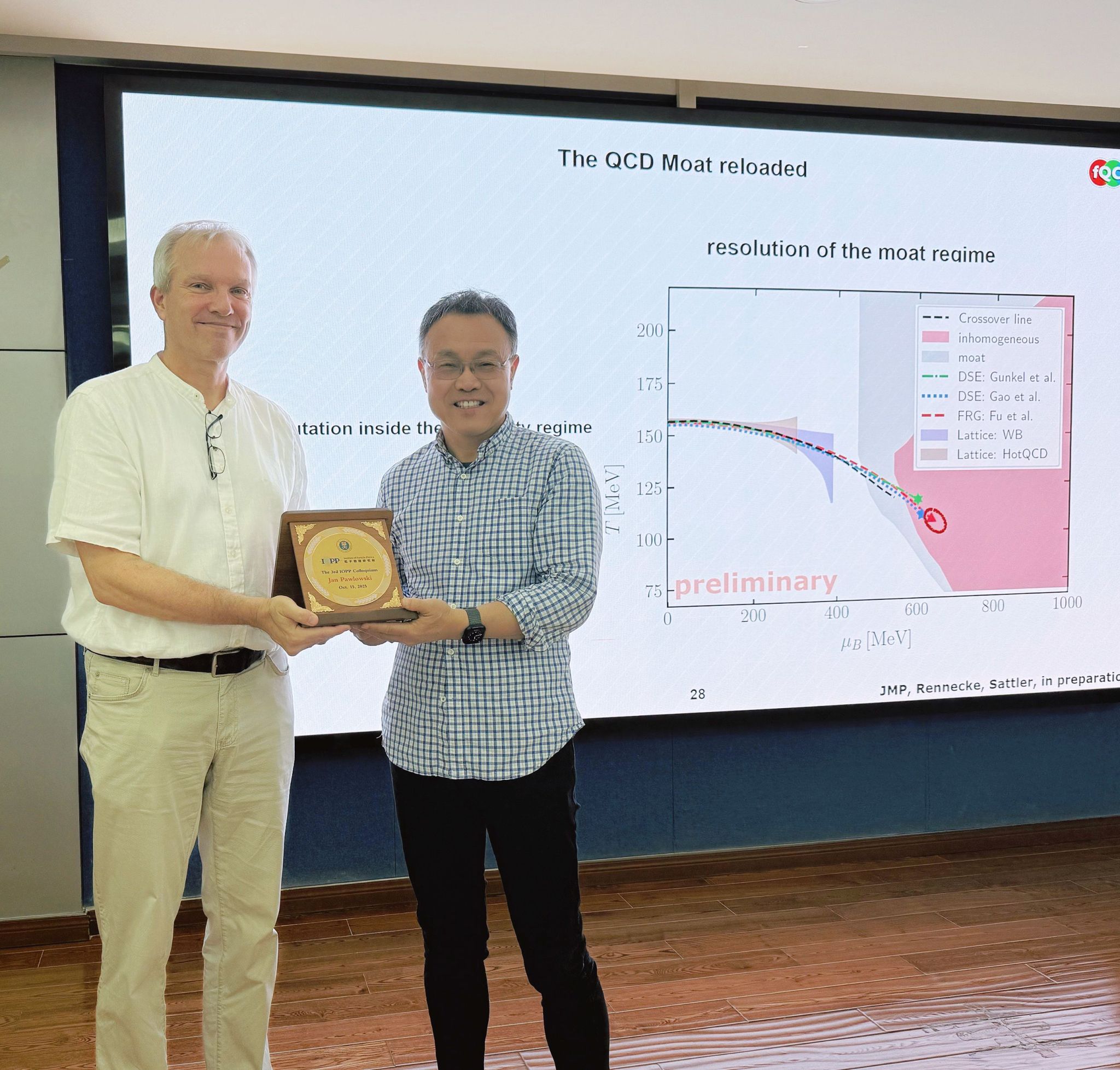Pawlowski教授的报告从量子色动力学(QCD)的基本理论切入,系统阐释了QCD在不同能标下的行为特征。他指出,在高能条件下QCD表现为弱相互作用的夸克和胶子理论,而在低能条件下则进入强关联区域,出现手征对称性破缺和色禁闭现象。报告重点展示了多项前沿研究成果:通过夸克凝聚揭示了350MeV能标下的质量生成过程,为理解QCD低能行为提供了关键依据;深入探讨了QCD相图中的临界点(CEP)寻找问题,特别是在相结构研究中护城河"(Moat regime)点新概念;结合重离子碰撞实验数据,分析了如何通过重子数涨落捕捉临界点的"涟漪效应",展现了理论与实验的深度融合。