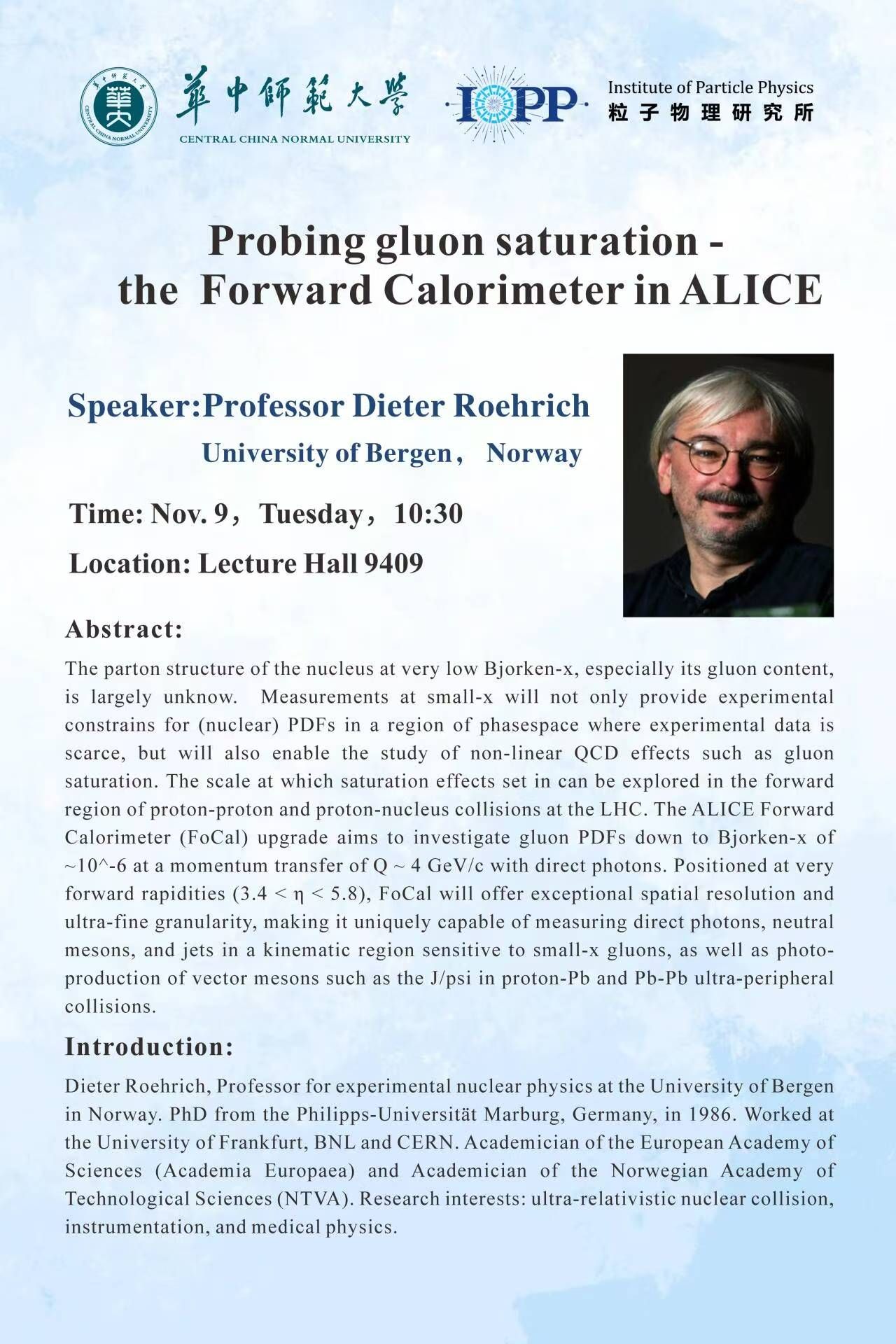 Dieter Roehrich, Professor for experimental nuclear physics at the University of Bergen in Norway. PhD from the Philipps-Universität Marburg, Germany, in 1986. Worked at the University of Frankfurt, BNL and CERN. Academician of the European Academy of Sciences (Academia Europaea) and Academician of the Norwegian Academy of Technological Sciences (NTVA). Research interests: ultra-relativistic nuclear collision, instrumentation, and medical physics.