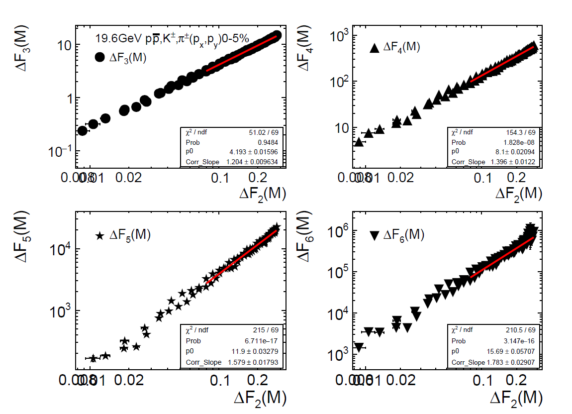 理论预言,如果重离子碰撞系统中存在由相变产生的间歇,高阶阶乘矩Fq(M)和二阶阶乘矩F2(M)之间将满足严格的标度关系,目前的实验结果的确观察到该标度关系,如下图所示。