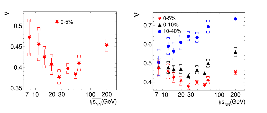 如下图所示,对于最中心0-5% 碰撞的系统,v随碰撞能量变化的关系显示为非单调行为,并且在质心碰撞能量 = 20-27 GeV 范围内达到最小值,预示着Au+Au碰撞系统的ν值20-27 GeV范围内发生特殊的变化,这有可能是临界点所引起的密度涨落起伏所导致。同时,该非单调行为在0-10% 中心度碰撞系统中减弱。然而,在10-40% 中心度碰撞系统中,ν值一直随着能量的减小而减小。如下图所示,从中心碰撞到半中心碰撞,v 值都一直增大,显示单调依赖的关系,说明v值的大小和碰撞系统的大小成反比。