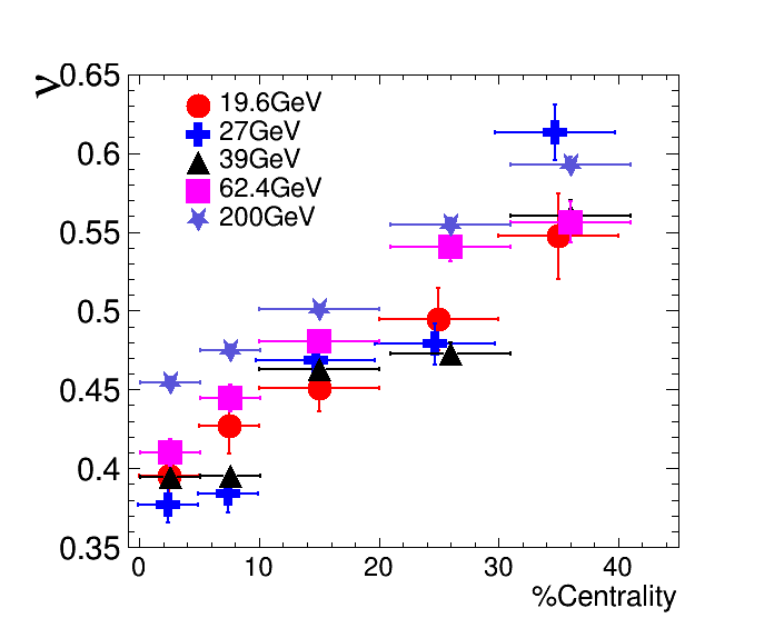 Au+Au 碰撞中能量=19.6, 27, 39,62.4,200 GeV下的ν值和中心度的依赖关系