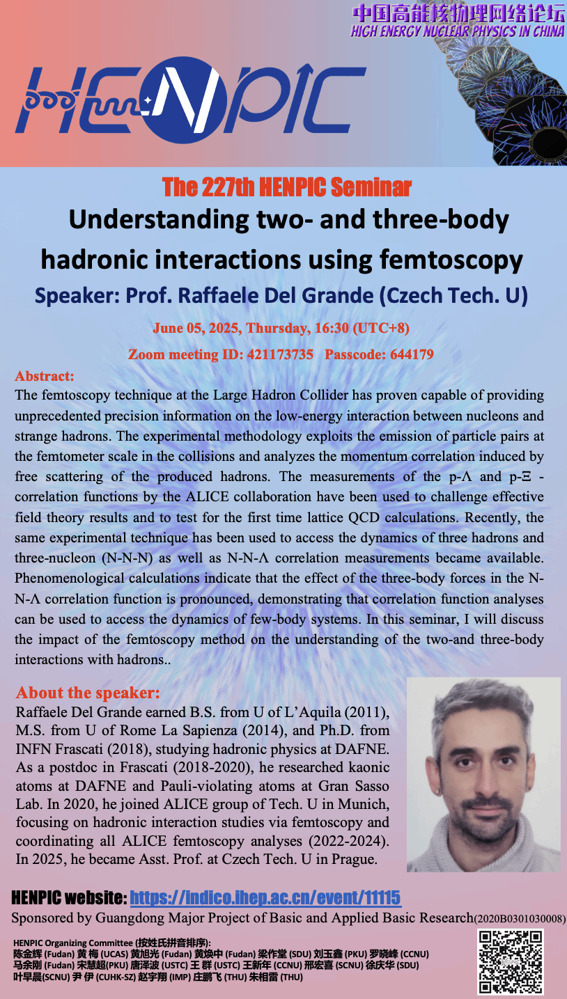 Raffaele Del Grande earned B.S. from U ofL'Aquila (2011),M.S. from U of Rome La Sapienza (2014),and Ph.D. fromINFN Frascati (2018), studying hadronic physics at DAFNE.As a postdoc in Frascati (2018-2020), he researched kaonicatoms at DAFNE and Pauli-violating atoms at Gran SassoLab. In 2020, he joined ALICE group of Tech. U in Munichfocusing on hadronic interaction studies via femtoscopy andcoordinating all ALICE femtoscopy analyses (2022-2024)In 2025, he became Asst. Prof. at Czech Tech. U in Prague.